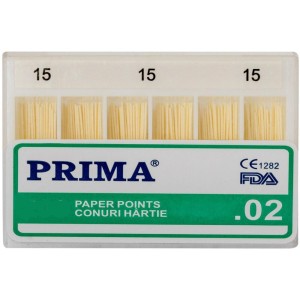 Descopera conurile de hartie .02 Prima, solutia ideala pentru uscarea canalelor radiculare in tratamentele endodontice. Acestea sunt fabricate din hartie de calitate superioara si sunt disponibile intr-o gama variata de culori pentru identificare rapida.Caracteristici principale:• Dimensiuni variate: disponibile in grosimi de 15, 20, 25, 30, 35 si 40, cu conicitate .02• Culori distincte: alb, galben, rosu, albastru, verde, negru – codificare coloristica pentru o utilizare eficienta• Material: hartie de calitate superioara, asigurand o absorbtie ridicata• Design conic: faciliteaza uscarea eficienta a canalului radicular• Ambalare practica: cutie compartimentata pentru organizare usoara• De unica folosinta: pentru utilizare sigura si igienicaAplicabilitate in stomatologie:Conurile de hartie .02 Prima sunt esentiale pentru uscarea canalelor radiculare in procedurile endodontice, asigurand un mediu optim pentru sigilare.Mod de utilizare:Introduceti conul de hartie in canalul radicular pentru a absorbi excesul de umiditate si a pregati zona pentru etansare.Alege conurile de hartie Prima pentru eficienta si precizie in tratamentele endodontice!