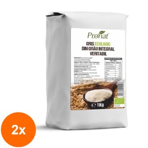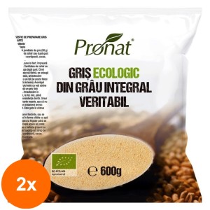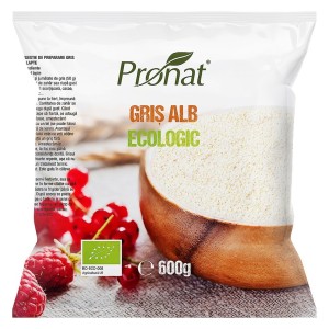 Gris Bio din Hrisca, 350 g, Pronat Crupe de hrisca (macinate mediu). Ingrediente: gris din hrisca*. *=din culturi certificate ecologic. Ambalat intr-o unitate care proceseaza: cereale cu gluten, fructe cu coaja, soia, arahide, produse lactate, telina, mustar, lupin. Conditii de pastrare: loc uscat si racoros. Se poate utiliza pentru gris cu lapte, budici, papanasi, galuste cu prune, prajituri si patiserii sau ca ingredient pentru supe. Termen de valabilitate: a se vedea data inscriptionata pe ambalaj/eticheta.