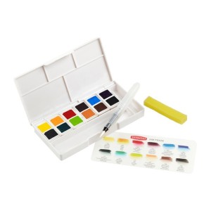 Culori acuarela fine, foarte intense si rezistente la lumina. Pentru diverse tehnici de pictura si desen. Se poate desena direct cu pastila sau se transforma in godet de acuarela, prin diluare cu apa. Echivalentul unui tub de 17ml de acuarela lichida. Setul contine: