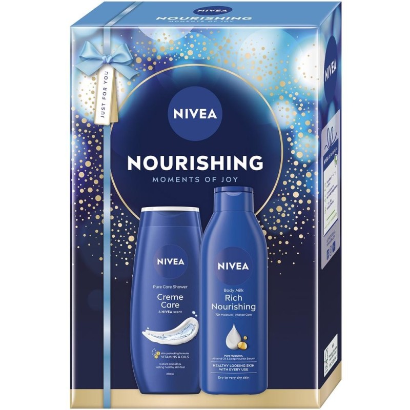 Set Cadou Femei Nivea Nourishing, Lapte Corp 250 ml, Gel Dus Creme Care 250 ml Set cadou NIVEA Nourishing pentru femei, cu lapte corp 250 ml si gel dus Creme Care 250 ml, pentru hidratare intensa si ingrijire delicata. Beneficii: Lapte de corp hranitor pentru piele catifelata Gel de dus cu formula delicata pentru curatare blanda Ambalaj elegant, perfect pentru cadou